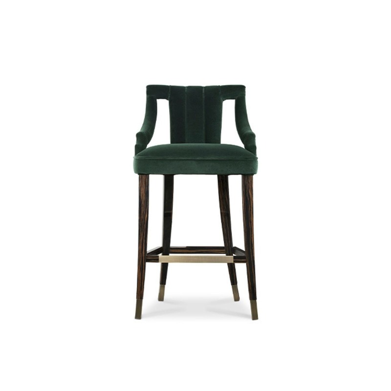 Cayo Bar Chair is a high-back bar chair that has legs in ebony wood veneer gloss with a glossy aged brass finish with green moss velvet upholstery. The Cayo High Back Bar Chair will bring unique nature beauty into your bar design. The Cuban Cayo Island is a natural wonder with beautiful landscapes and an impressive green sea. This beautiful scenario inspired the design of the Cayo Bar Chair.
