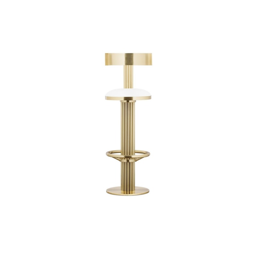 Kelly Bar Chair is inspired by the sculpted arches from the bar in the classic movie Casablanca, it’s a timeless and unforgettable piece. Besides being stylish, it is made to be comfortable and stand the test of time. The body is a full piece of polished brass and features a low back, a foot rail, and brown leather on the seat.