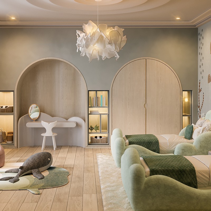 To make the space more comfortable and to allow kids to play on the floor, the Whale’s Tale Rug was added. This rug was inspired by kids’ favorite tales about the ocean and about the whales. These amazing animals are known to be history keepers and they symbolize emotional and peaceful strength.