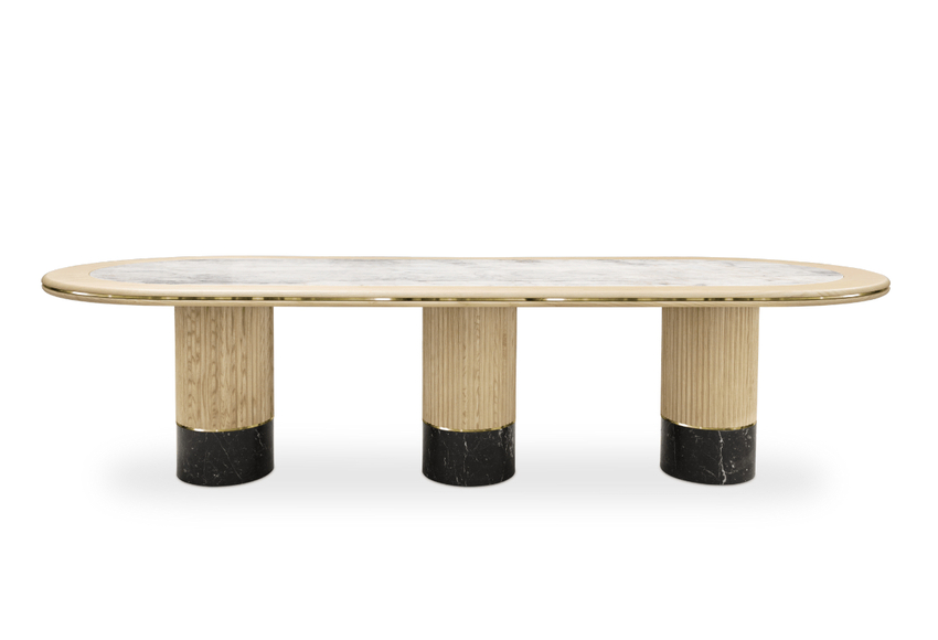 An oval dining table provides the length of a rectangular table without the harsh corners and provides a little more floor space. Anjelica Oval Dining Table is a modern oval dining table for 12 featuring an ash wood structure with a matte varnish finish, a tabletop in White Vogue Estremoz marble, legs in Nero Marquina marble, and some elegant details in polished brass.