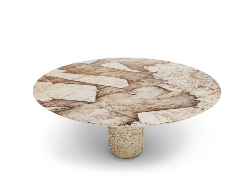 Patagon Round Dining Table culminates the inspiration for the overall Patagonian Collection. The interesting and unique foot of the table, with little globes representing each archipelago, glacier, landmass, and city in the Patagonian region. A circular Patagonian marble top is the culmination of this homage, while the champagne lacquered foot represents the region’s individuality and natural beauty.