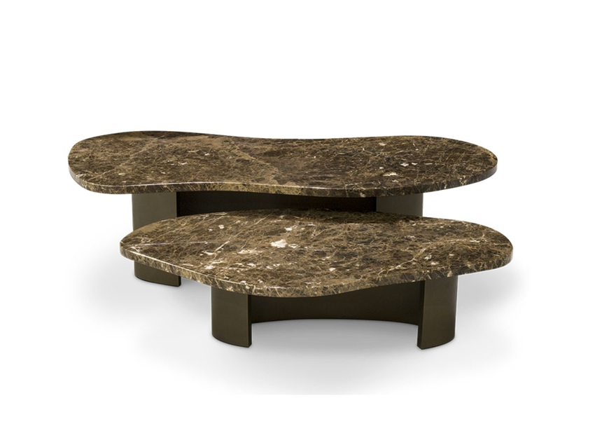 Robusta Center Table has both a soft and yet eye-catching presence. With an uneven shape, taking inspiration from the disformity of the sub-Saharian plains where the famous Coffea Robusta is grown. Its two marble tops resemble the hues of brown from the exquisite coffee beans and rest perfectly on a delicate and continuous bronze leg. The perfect piece to provide a simple and neutral complement to a modern interior.
