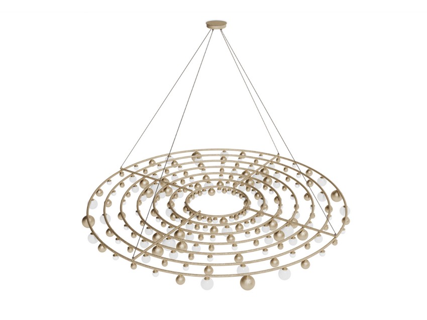 The circular Patagon Suspension Lamp culminates the inspiration for the overall Patagonian collection. Various metal champagne circles of different circumferences are composed of little globes representing each archipelago, glacier, landmass, and city in the Patagonian region. Using frosted white glass and metal champagne for this illuminating piece, reflecting the many colors and tones reflected in the Marble Caves, one of the most well-known places of the Patagonian Andes.