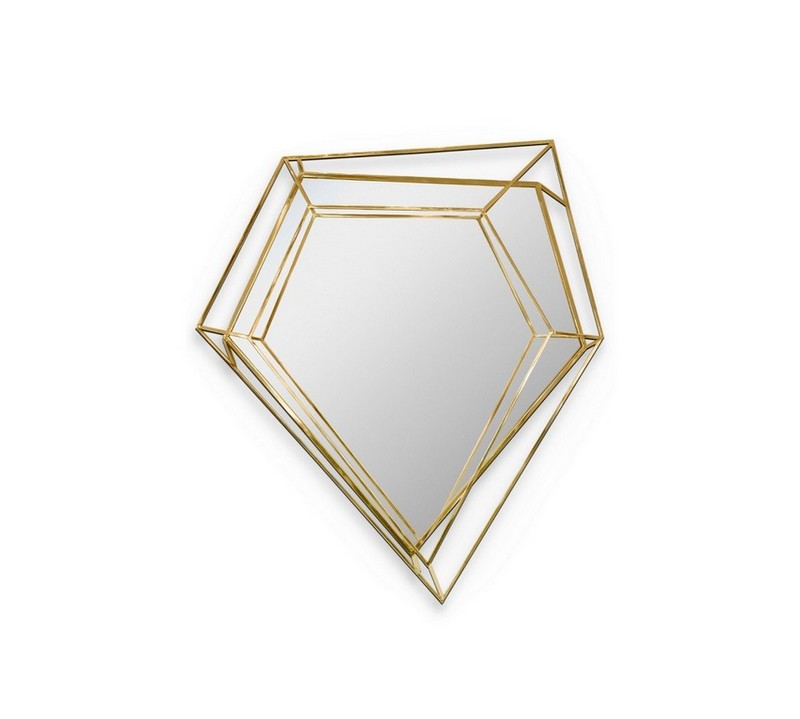 Inspired by the asymmetrical and dazzling shapes of a diamond rock, this five-sided polygon small wall mirror is the ultimate combination of geometry and design. The use of a polished brass structure enhances the luxurious element within this object resulting in a sophisticated dynamic piece that stands out in any ambiance. With a mid-century modern touch.