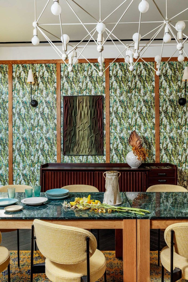Eye-catching details include a sculptural staircase installation of 60 patch-worked vintage rugs and a monolithic timber and ceramic grandfather clock in the lobby of Kelly Wearstler’s boutique hotel. Surfaces add textural interest, with local artists and materials featuring prominently throughout. Such elements include pots, trays and cabinet inlay tiles by ceramicist Rick Van Dyke; locally quarried travertine on the pool deck; Delta wood paneling; native elmwood; and antique mirror finishes.