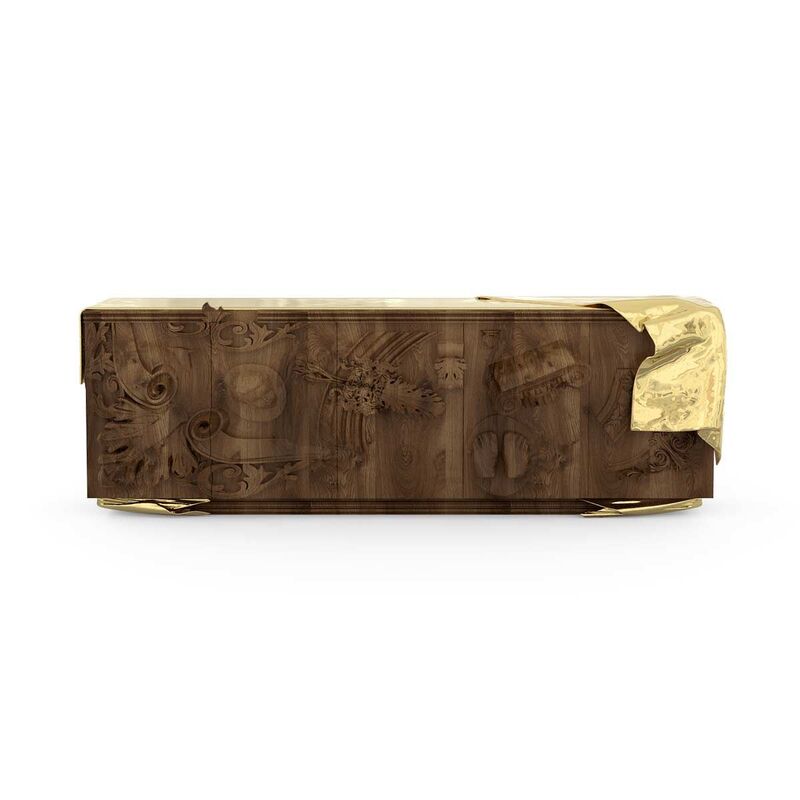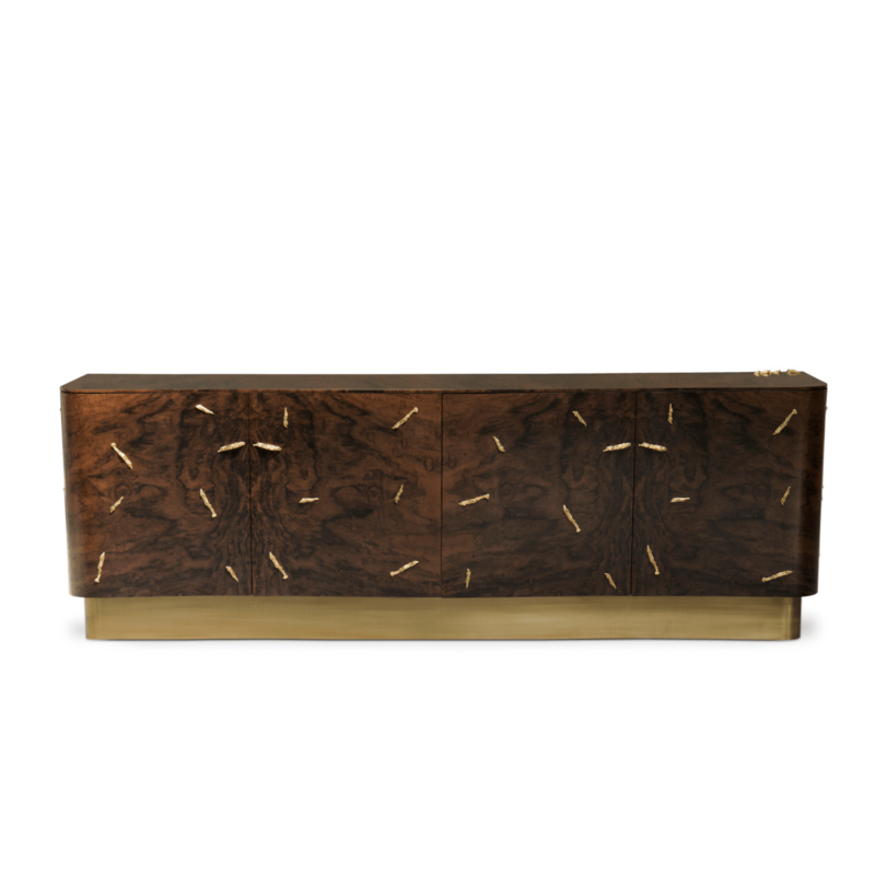 Baraka Sideboard is charismatic by its never-ending contrasts between ancient and contemporary lines. Baraka Sideboard‘s body’s half brightness combines walnut root veneer with brass details, an interior in bird eye wood veneer, and the base in vintage matte brass. This exquisite design piece that stands out outside of historical time will enhance the beauty of Baraka energy in your modern living room set. Baraka is an ancient Sufi word that means ”a blessing – the breath of life -, or essence of life” from which the evolutionary process unfolds.