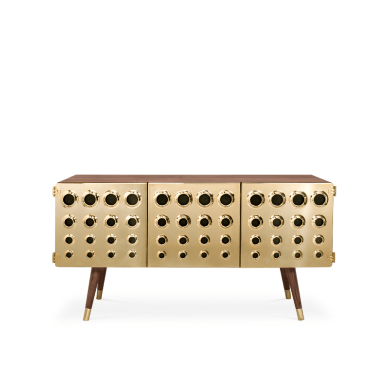 Monocles Sideboard is a perfect furniture piece for retro lovers and mid-century admirers. Built entirely out of solid walnut wood, accented by its gold-plated brass front doors that feature a protruding circular design. These circles are then engraved to the back and side of the unit, giving it an extreme character and high-end look.