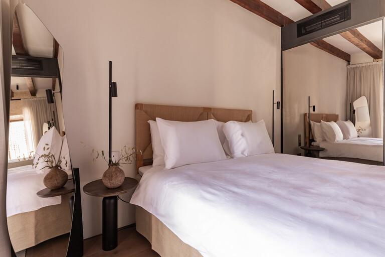 The building carries centuries of history, and instead of erasing it, the design leans in. Original architectural elements sit comfortably alongside contemporary lines. You notice textures first, aged stone, soft fabrics, warm wood, then the way light moves through the spaces, filtering in gently and settling into corners. It’s minimal without feeling cold, curated without feeling staged.