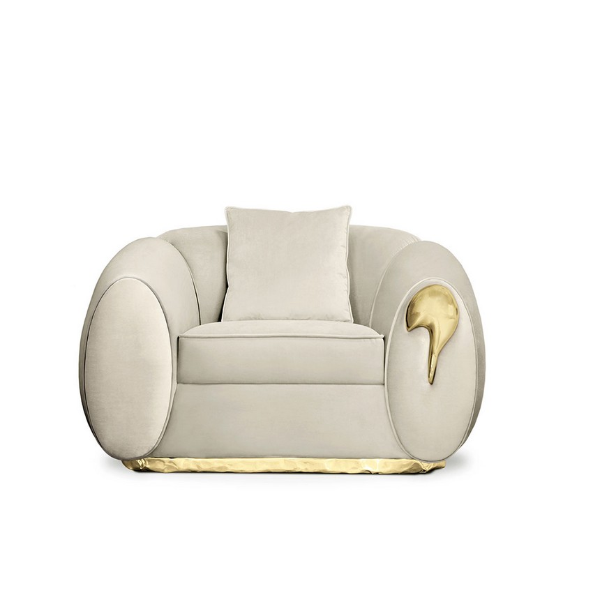 Flanking the entire room, we can feel all the comfort and elegance provided by two iconic pieces from Boca do Lobo, belonging to the Soleil family. Both armchair and sofa are the perfect examples of applying and elevating the modern classic style. These have, as fundamental supports, Vinicius Side Table, by Essential Home, a clear mid-century inspiration, without forgetting great lighting models, such as Apache Table Lamp, from Brabbu, wrapped in an eclectic combination of walnut, yellow and gray tones, and the neutral Simone Wall Lamp, by Delightfull, which covers the entire room in a very functional way.
