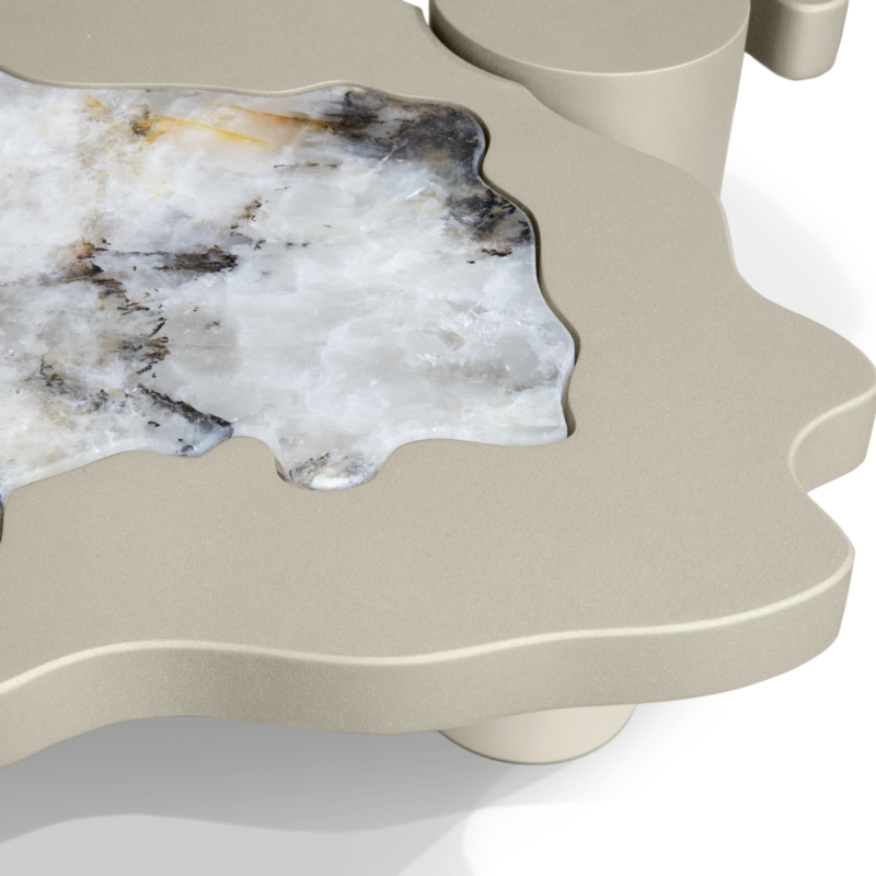 This amorphic contemporary center table gathers its name from the art of creating thin sheets of rock. Expertly crafted, Slater Center Table consists of exactly four slates of Patagonia marble merged with refined metal champagne. Leveled in different dimensions to give a natural, organic vibe.