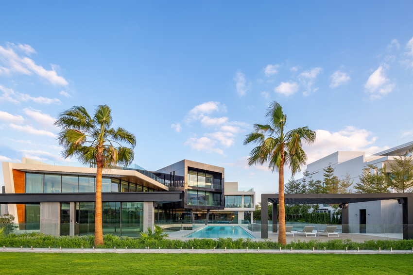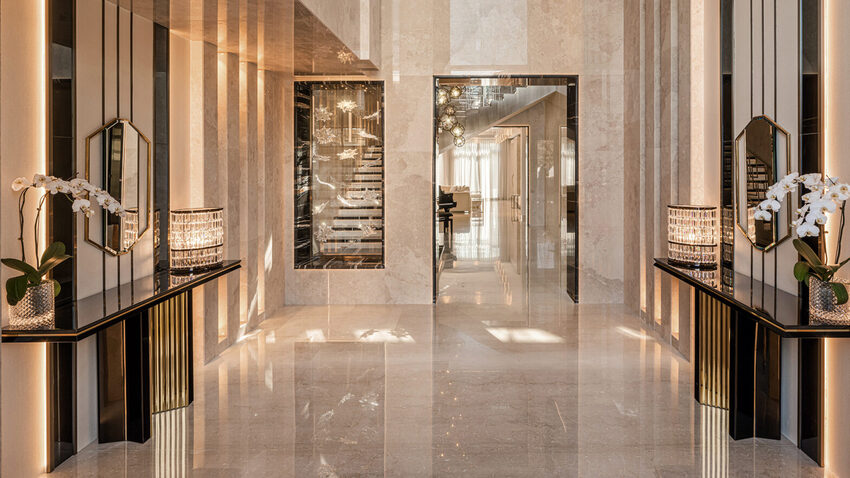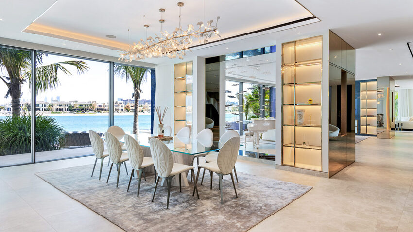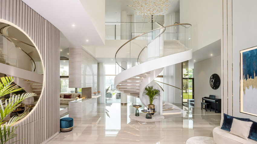 A luxurious villa located on Palm Jumeirah with beachy vibes, a calming color palette and open spaces. Unique lighting fixtures can be found throughout the home with marble textures in place to add to that high end feel.