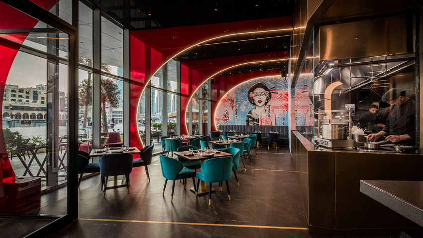 Situated on the ground floor of The Dubai Mall, KATA, the new Japanese Fusion restaurant, overlooks the famous Dubai Fountains. With a striking yet simple color palette, this restaurant was designed with a rich, and luxurious setting in mind. The use of translucent materials like decorated acrylics, and reflective surfaces such as mirror, and metal finishes in bronze and brass, creates a luxurious and welcoming atmosphere. The Robata grill show kitchen, enclosed in glass and bronze is a real showstopper. As is the Raw Bar, which is a dark pocket in this bright interior, allowing the food to shine.