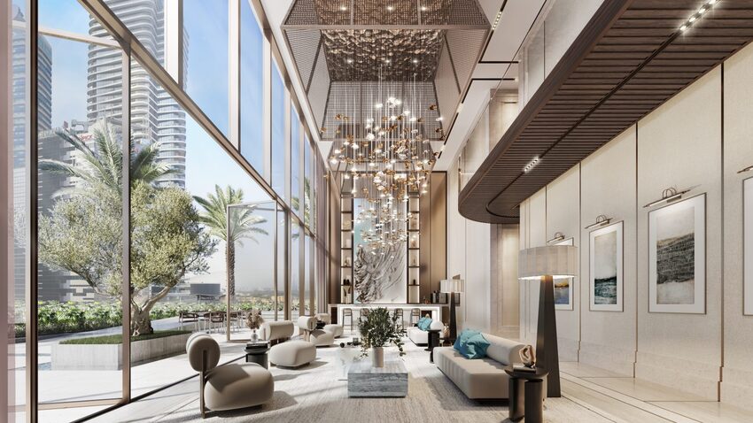 St. Regis Financial Road – The Residences is a 60-story tower located in Downtown Dubai. It has stunning views of Burj Khalifa and the Dubai Canal. It includes 250 units ranging from 1 to 5 bedroom apartments and amenities such as lounge, library, boardroom, cinema, and games room are included in the building. Inspired by traditional areesh houses, ghaf trees, falaj systems, pearl diving and arabian coffee, the St Regis project is linked to UAE from historical, physical and social perspective.