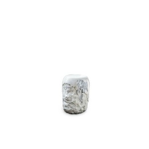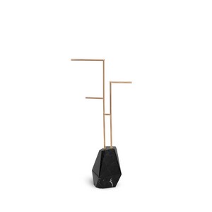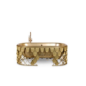In tuhis bathroom we can observe the Koi Bathtub, features an aged brushed brass base resembling the scales pattern of the Japanese Koi carp. The contrived patina iron tub has an oval shape and a curved lip, making it the perfect resting spot for your head. The name of this contemporary bathtub and the Japanese word for love are homophones making the carp a symbol of love and affection, perfectly combined with Wall Lamp Basie, which is a modern representation of the sci-fi aesthetics of the 1960s. The vintage mid-century lamp has a set of distinctive features which make it a stunning statement piece. It is an indoor wall light handmade in brass, with a center shade made in aluminum and a mesmerizing gold-plated standard finish. The lamp shade is lacquered a glossy white for a more modern look. Being the sleek and sophisticated piece that is, it works beautifully as a decorative wall light in any space, combined with Yoho Stool, which refers to the Yoho National Park which is known for its expansive glaciers and impressive waterfalls. Made of Carrara marble, YohoStool is a tribute to this natural beauty. Place it in a modern interior design and this contemporary stool will complement it, adding an exclusive touch.