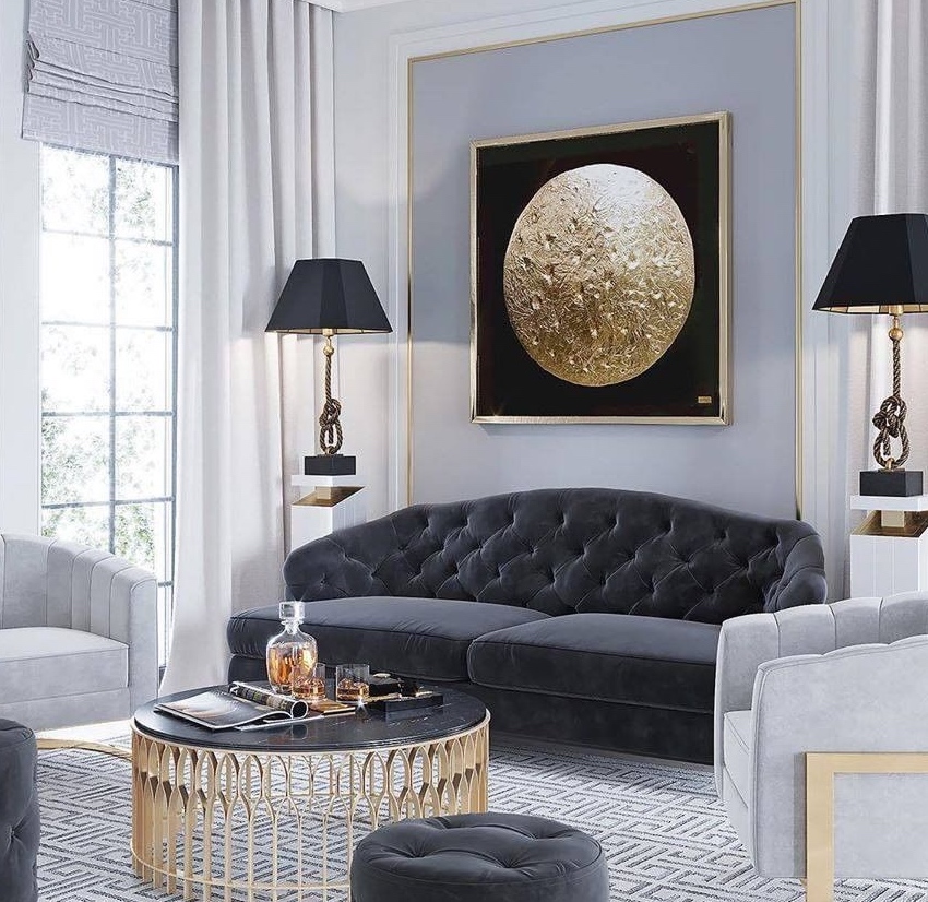 Living Room with golden accents, an ambiance in shades of gray with dazzling golden details.