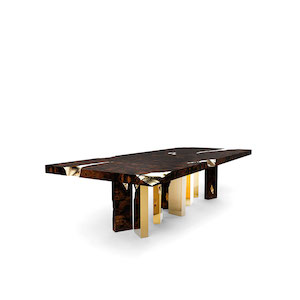 As the centerpiece of this project, we bring to you the Empire Dining Table, by Boca do Lobo, which symbolizes generations of gatherings and decisions, both in times of celebration and tension. Its cracks reflect tough times, revealing a gold interior in a manifesto towards power. Flawless and bright, the remaining surface points towards a thriving future, reminding one to toast to prosperity. Great empires take centuries to build, and those who rise after taking a fall find their true strength. Great decisions are taken around powerful tables among determined minds. This luxury statement table makes the perfect center point of any luxury dining room.
