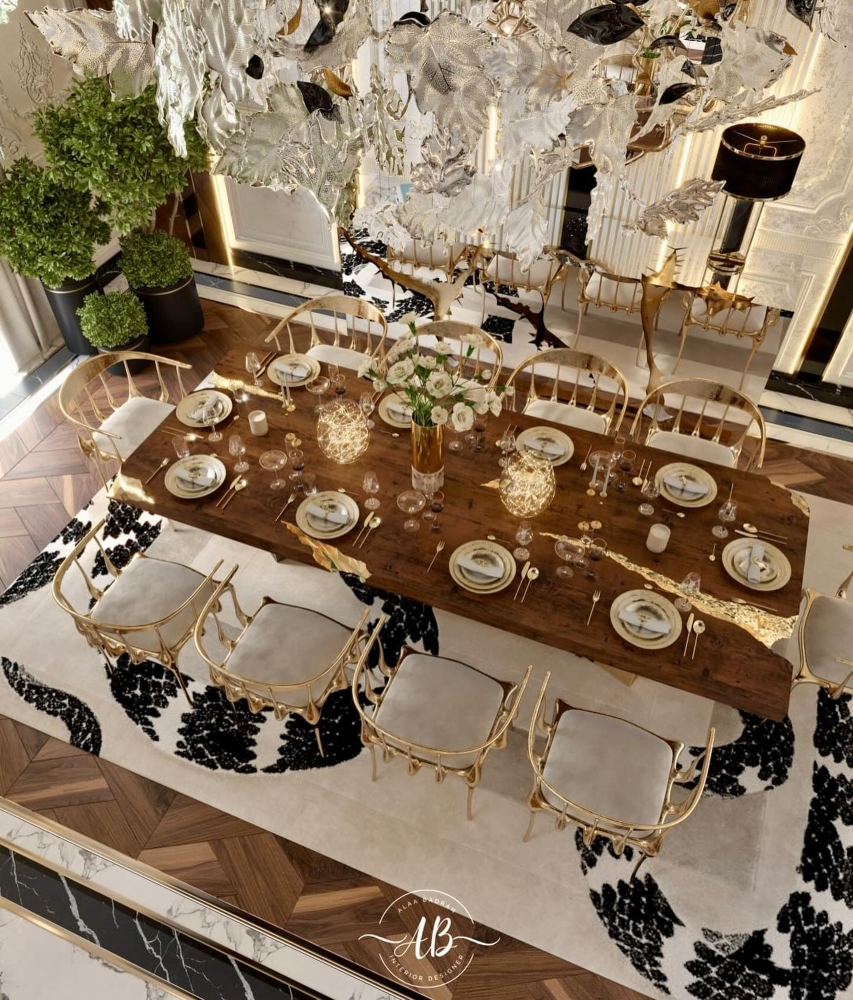This exquisite luxury dining room area, designed by Alaa Badran, epitomizes elegance and sophistication. Every detail has been meticulously crafted to create a harmonious blend of style and comfort. The space features high-end materials, refined finishes, and a thoughtfully curated color palette, all contributing to an atmosphere of opulence and warmth. With a focus on both aesthetics and functionality, Alaa Badran has designed a dining room that is not only visually stunning but also perfect for intimate gatherings and lavish dinner parties. Your luxury dining room should kindle a daily love affair. Is there anything more delightful than bringing together loved ones around a dining table? Not really! In this article, Covet House explores the essential elements that define a luxury dining room and offers tips on designing a space that radiates both elegance and comfort.