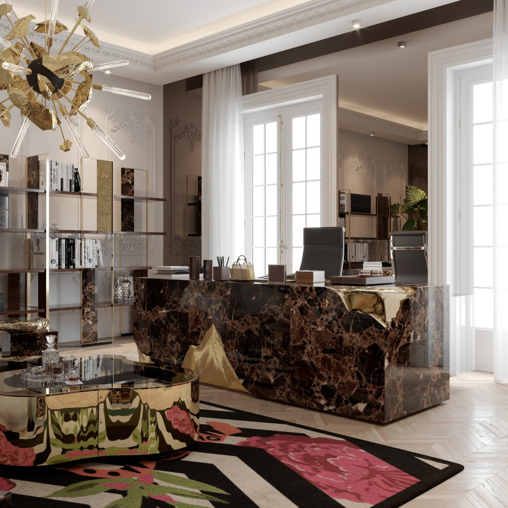 As the centerpiece of this project, we bring to you the Empire Dining Table, by Boca do Lobo, which symbolizes generations of gatherings and decisions, both in times of celebration and tension. Its cracks reflect tough times, revealing a gold interior in a manifesto towards power. Flawless and bright, the remaining surface points towards a thriving future, reminding one to toast to prosperity. Great empires take centuries to build, and those who rise after taking a fall find their true strength. Great decisions are taken around powerful tables among determined minds. This luxury statement table makes the perfect center point of any luxury modern apartment.