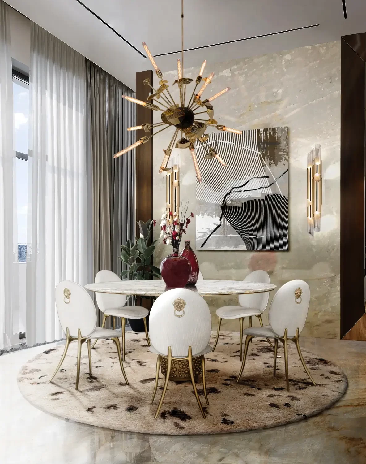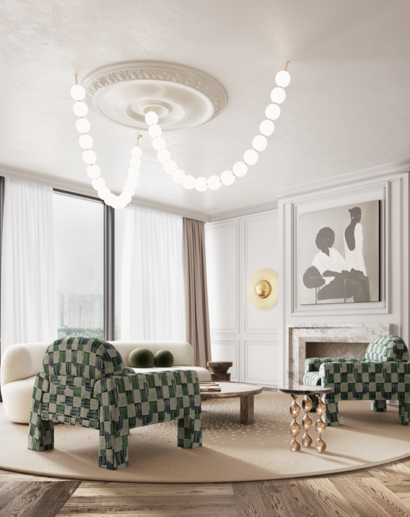 In our Parisian project, Juliette Byrne’s interior design expertise is evident in the selection of pieces that infuse warmth and elegance into the space. A prime example is the Soleil Wall Lamp by Brabbu. Inspired by the sun, this lighting fixture features a hammered brass structure that radiates light akin to sunlight rays, bringing a warm ambiance to the modern interior. Its discreet yet remarkable design complements the sophisticated aesthetic we aim to achieve, enhancing the harmonious blend of classic and contemporary elements that define this environment
