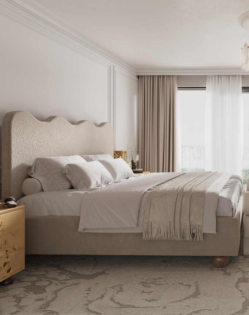 In our Parisian project, Juliette Byrne’s interior design expertise is showcased through the selection of pieces that blend elegance with narrative depth. A notable example is the Beverley Side Table by Essential Home, featuring a unique sculptural design crafted entirely from travertine stone. Its structure draws inspiration from the iconic lines of Italian design and architectural landmarks, adding an artistic touch to the space. This piece complements the sophisticated aesthetic we aim to achieve, enhancing the harmonious fusion of classic and contemporary elements that define this environment.