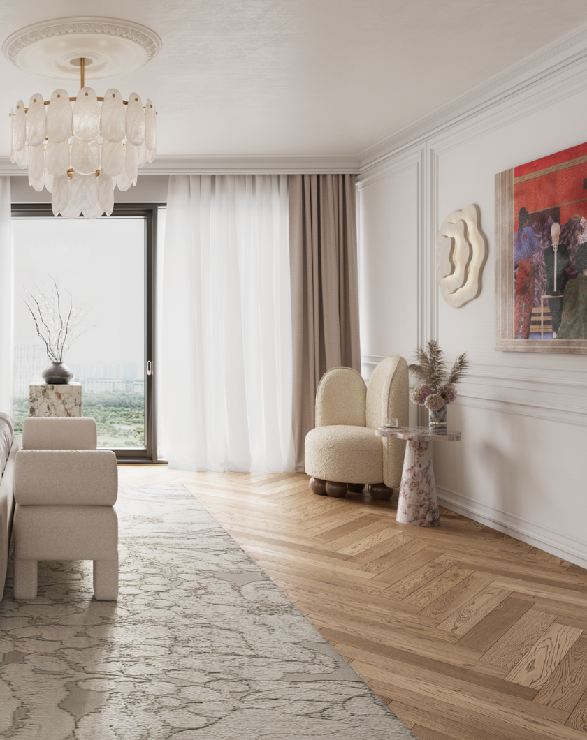 At the heart of Paris, in a renovated apartment exuding classic charm, we are bringing these principles to life. Drawing inspiration from the city’s timeless style, we’ve highlighted high ceilings, herringbone parquet floors, and marble fireplaces, while introducing pieces from Covet House that integrate beautifully into the sophisticated aesthetic.
