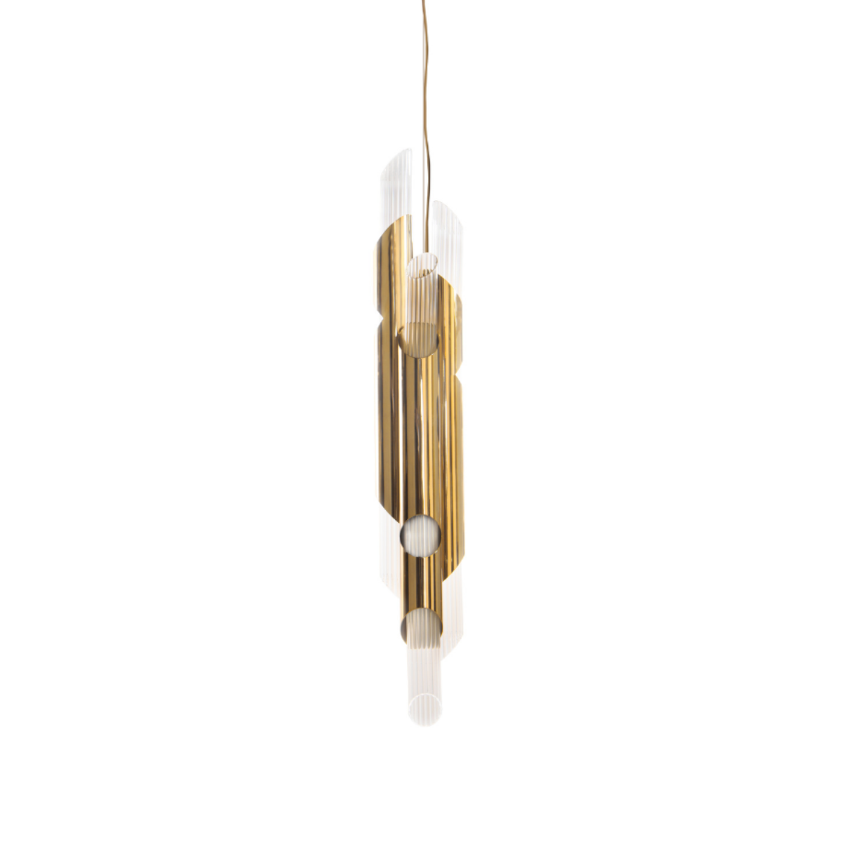 The Draycott Pendant Lamp by Luxxu is inspired by Draycott Tower, with a design featuring three tubes made of brass and crystal glass. Radiating sophistication and clarity, this exquisite piece is ideal for enhancing any space, especially in reception or lobby areas, perfectly aligning with Gilles Clement’s concept of luxury and refinement.