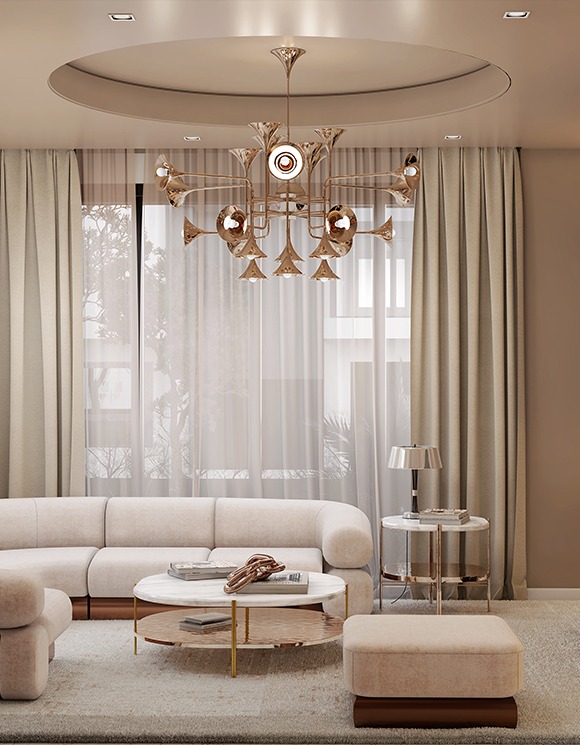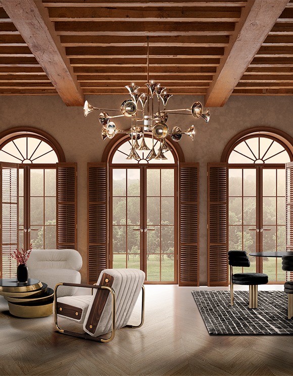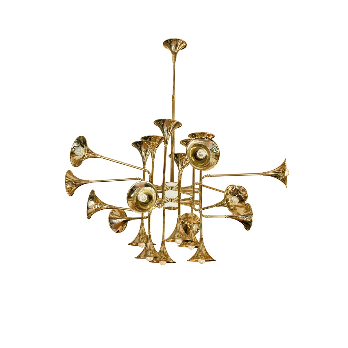 Botti modern chandelier instantly takes us into a music concert starring Chris Botti. The mid-century lighting design was inspired by the American trumpet player as a tribute to jazz music. With a structure handmade in brass and boasting a sophisticated gold-plated finish, this modern ceiling light showcases the high-quality craftsmanship for which DelightFULL is best known for. The brass chandelier goes as tall as 31,5 inches and uses 24 E14 bulbs, which are ingeniously placed at the end of the shades. Its unique shape and design make it the perfect hanging lamp to display on a mid-century modern living room, or a sophisticated hotel lobby.