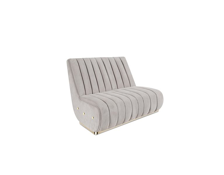 Sophia is a particular bench seat sofa that draws inspiration from the aesthetics of Mid-century Modern Design. It is upholstered in a neutral-colored velvet, stitched from the top to the bottom. The base is made of gold plated brass and it has button tufted sides. The slightly degree reclining turns it into a lounge sofa.